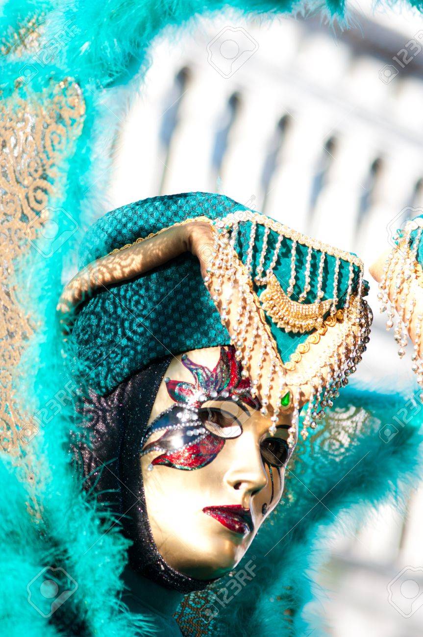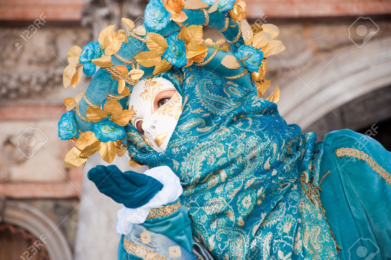 Carnaval Van Venetia Vrouw Met Blauwe Jurk En Wit Masker Kussen
