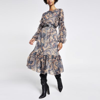 Blauwe Midi Jurk Met Strikceintuur Paisleyprint En Ruches River