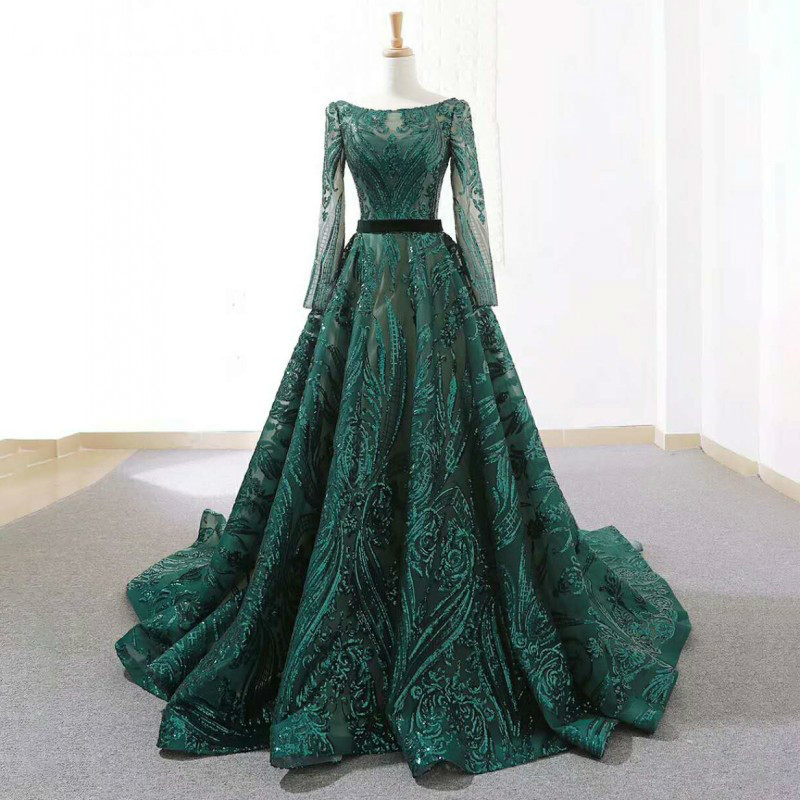 Mingli Tenga Emerald Green Sequined Long Sleeves Evening Dresses