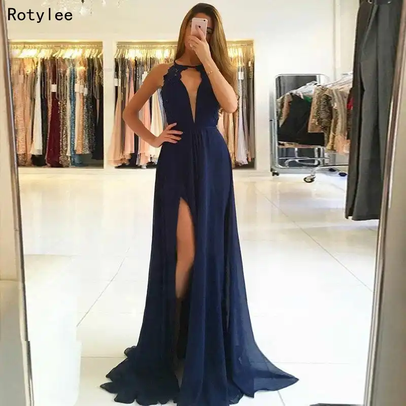 A Line Chiffon Navy Blue Prom Dresses Sexy Back Front Slit Gala