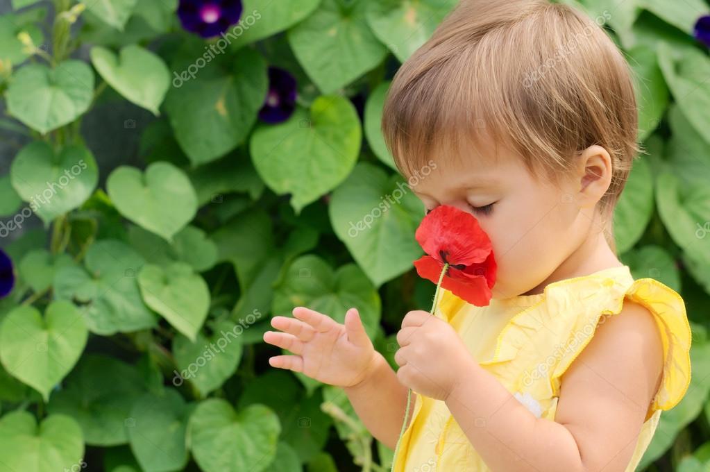 Meisje In Gele Jurk Ruiken Rode Papaver Bloemetje Stockfoto