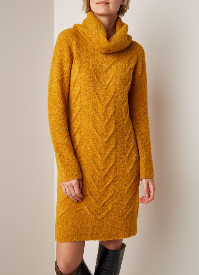 De gebreide jurk is misschien wel de meest comfortabele en multifunctionele jurk. Zo kan een gebreide jurk erg los worden gebreid met grof materiaal waardoor de jurk er bijna uitziet als een lange trui. Deze jurk in shiftstijl is gemaakt van gemengde garens met een all over dessin dat geaccentueerd wordt door effen ribmateriaal aan de hoge hals en mouwboorden. Gebreide stof kan namelijk ook tricot of jersey zijn.