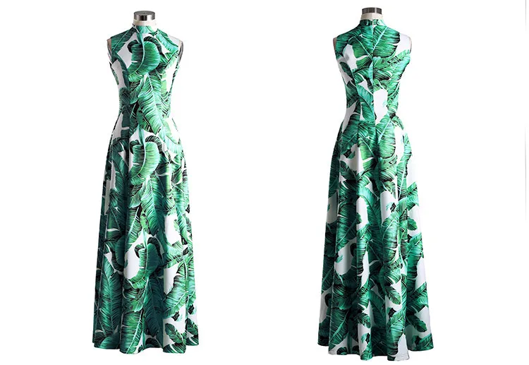 Aangepaste Vrouwen Vintage Jurk Maxi Groen Blad Gedrukt Sleeveless