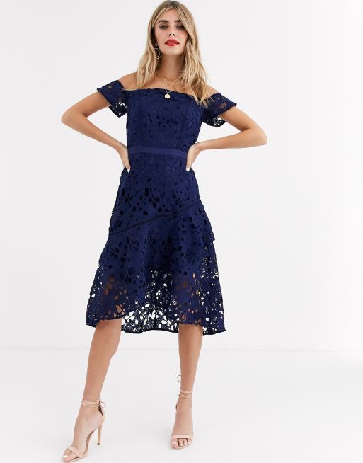 Chi Chi London Kanten Bardot Mini Jurk Met Zwierige Zoom In