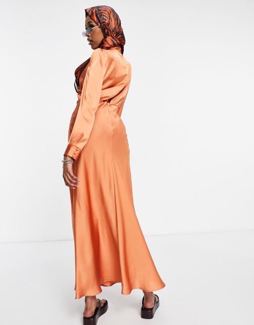 Asos Design Hoogsluitende Lange Jurk Van Satijn In Roestkleur Asos