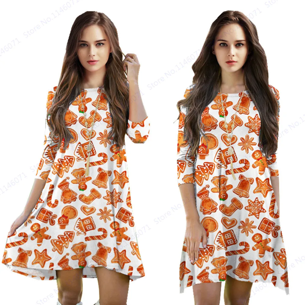 Oranje Vrolijke Vrouwen Jurken Kerst Ornament Print Jurk Driekwart