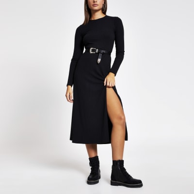 Zwarte Geribbelde A Lijn Midi Jurk Met Lange Mouwen River Island