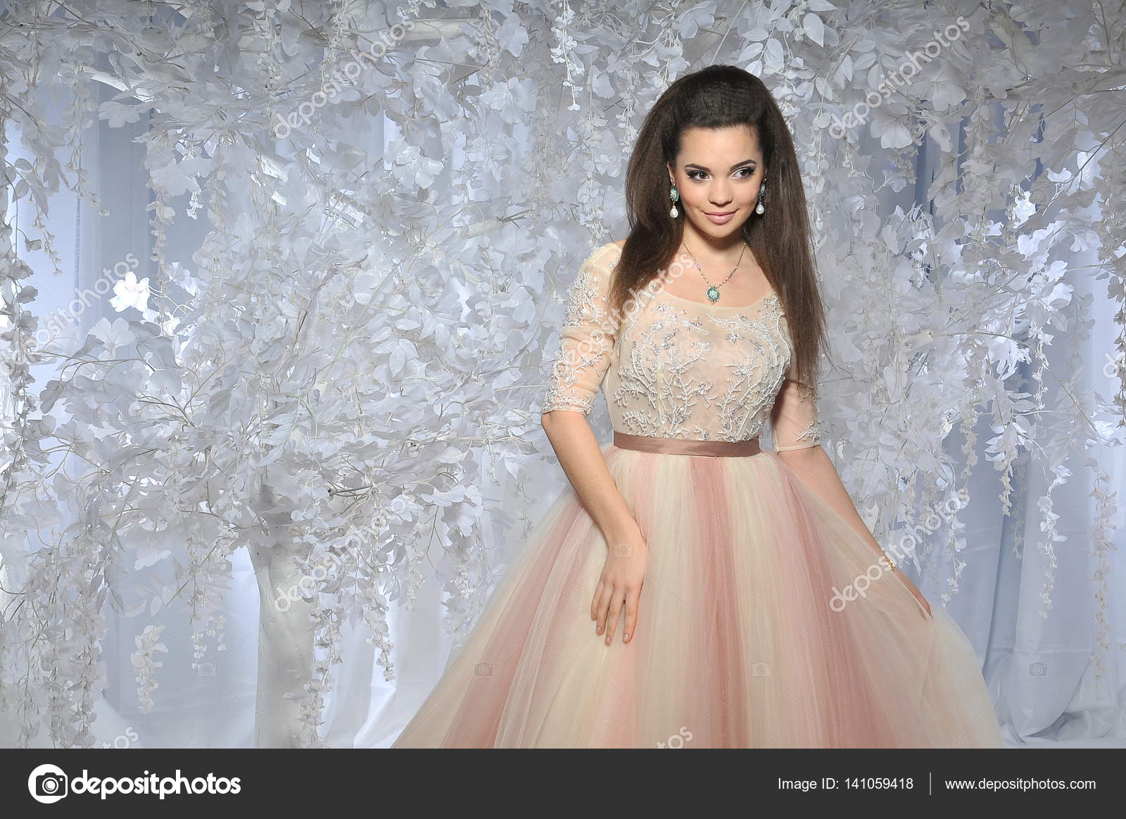 Mooie Brunette Model Meisje In Lange Jurk Met Witte Bomen Winter