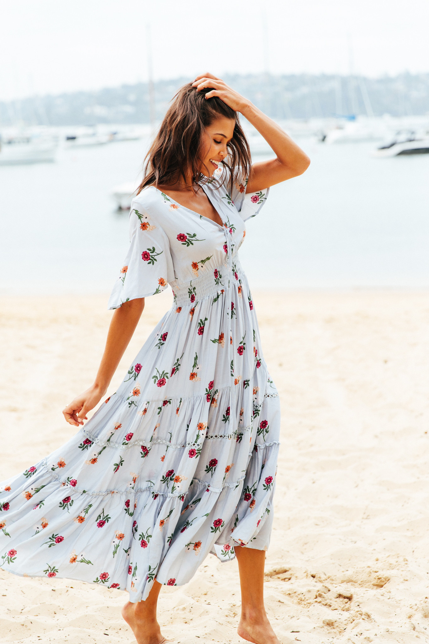 Lichtblauwe maxi jurk. Het model is 158 m lang heeft hakken aan van 7 cm hoog en draagt een maat s. Tropez look zijn sandaaltjes een zonnebril en een grote zonnehoed. Het enige wat je nog hoeft toe te voegen voor een stijlvolle st. We zijn druk geweest met het invoeren van nieuwe veiligheidsmaatregelen in ons magazijn en beginnen nu met het verzenden van bestellingen in het vk en ierland.