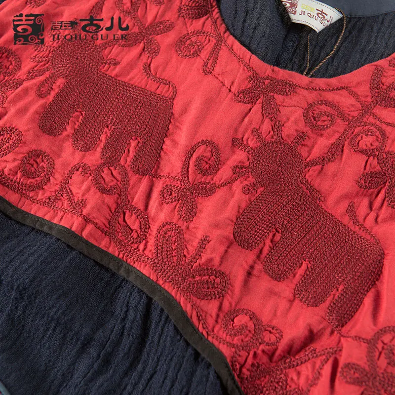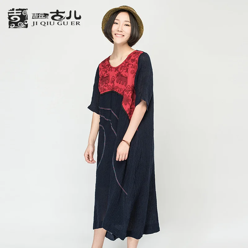 Jiqiuguer Vrouwen Borduren Patchwork Linnen Jurk Blauw Half Mouw V