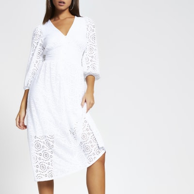 Witte Gesmokte Broderie Midi Jurk Met Lange Mouwen River Island