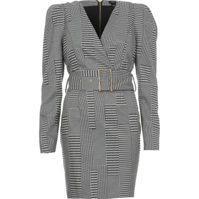 Zwarte Geruite Mini Jurk Met Overslag Voor En Ceintuur River Island