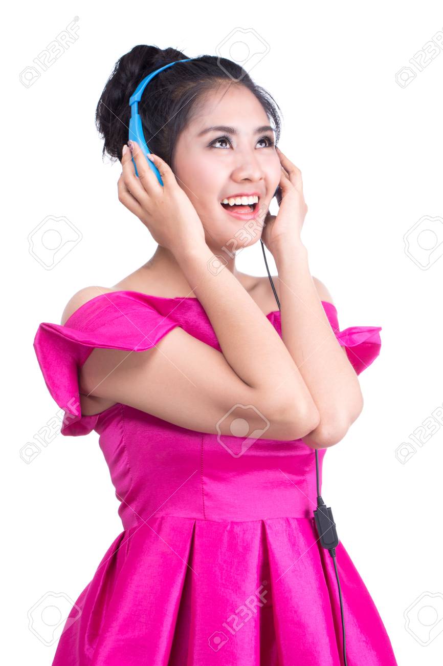 Vrouw Draagt Een Roze Jurk Luisteren Naar Muziek Op Een Witte