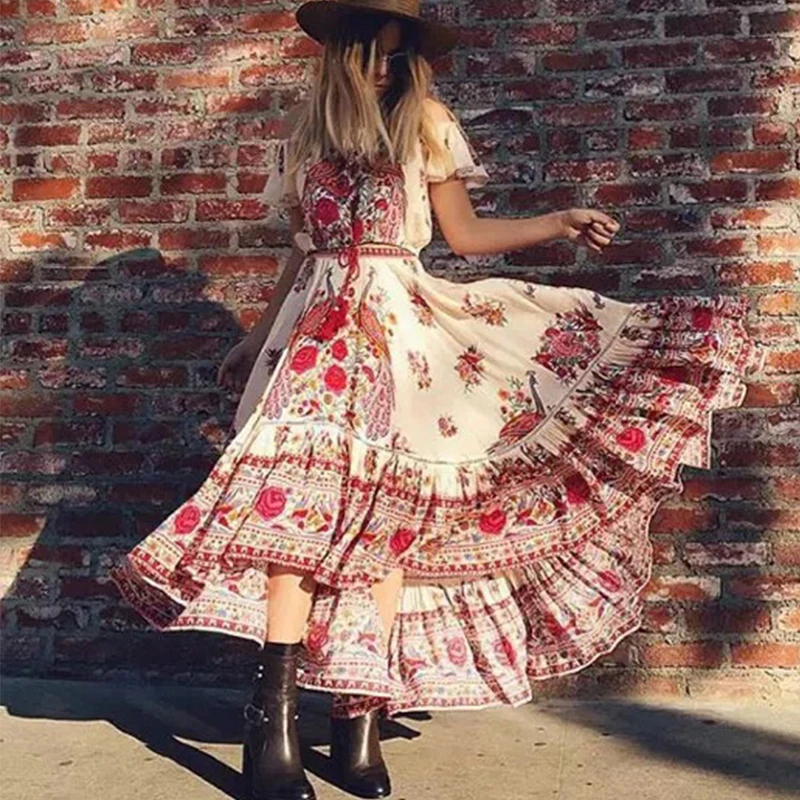 Vintage Floral Boho Beach Dress Summer Women Sexy Off Shoulder