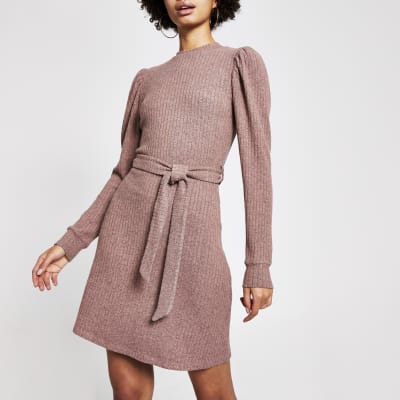 Roze Geribbelde Mini Jurk Met Pofmouwen River Island