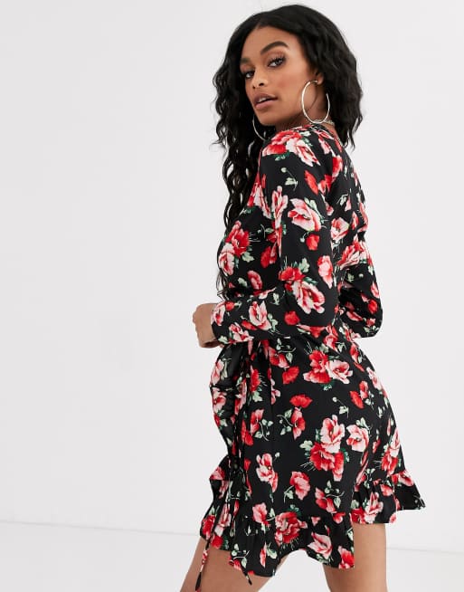 Boohoo Mini Jurk Met Overslag In Zwart Met Rode Bloemenprint Asos