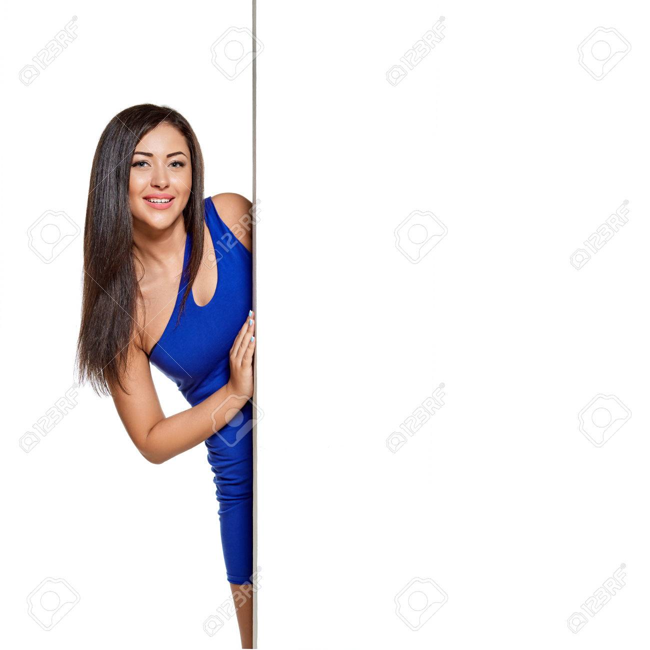 Mooie Smiley Vrouw Gluren Uit Van Achter De Walll Gekleed In Een