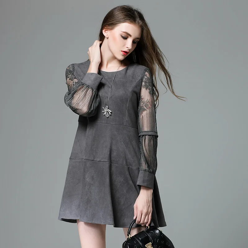 Plus Size Suede Jurk Vrouwen Stijl Kant Mouw Tunieken Spliced