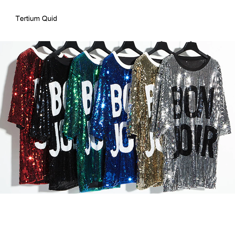 Women T Shirt Dress Summer Glitter Sequin Dress O Neck Long Keen Lengt
