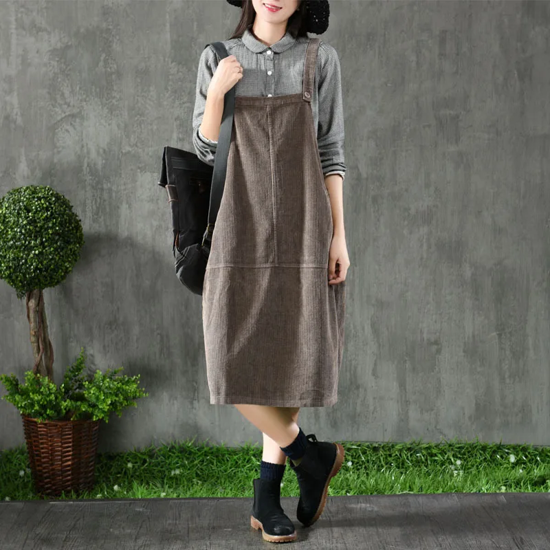 Runback Corduroy Elegant Midi Dress Women Winter Warm Velvet Pinaf