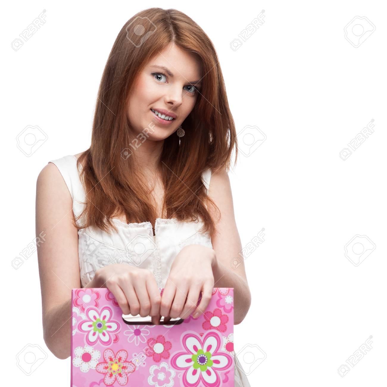 Vrolijke Roodharige Vrouw In Het Kort Witte Jurk Bedrijf Rode