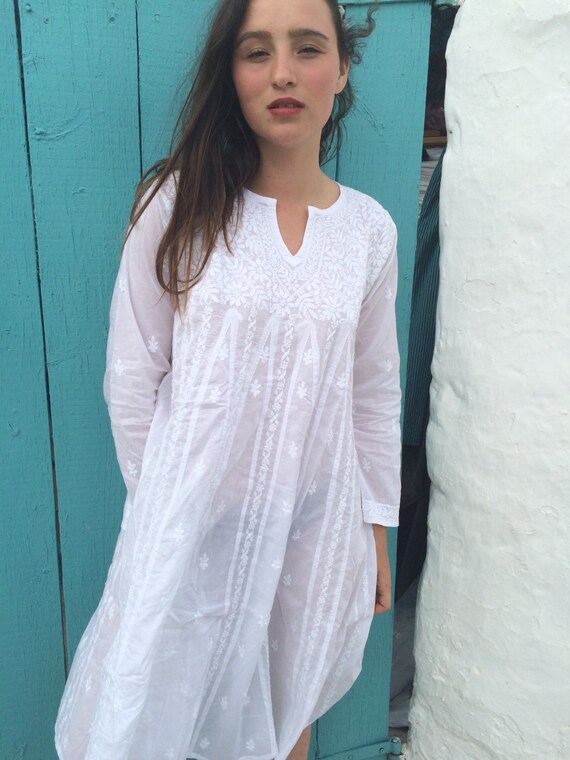 Witte Lange Boho Katoenen Jurk Met Volledige Hand Borduren Etsy