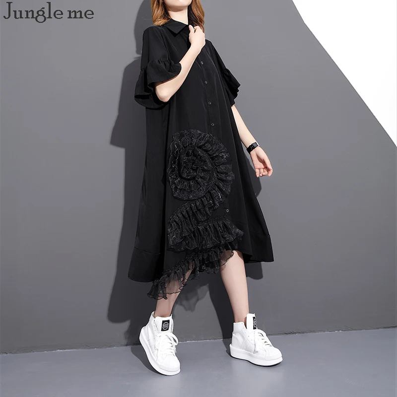 Jungle Me Ruches Lotus Mouw Zwarte Jurk Shirts Organza Bloem