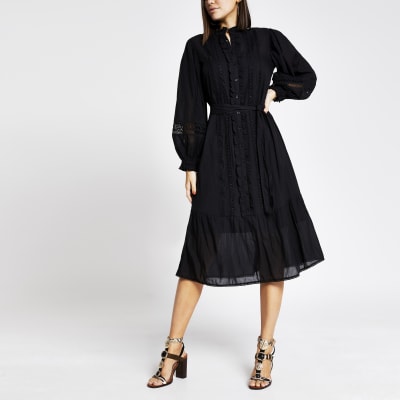 Zwarte Geborduurde Midi Jurk Met Lange Mouwen River Island