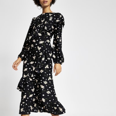Zwarte Midi Jurk Met Print Lange Mouwen En Ruches River Island